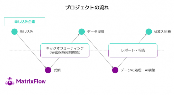 プロジェクトの主な流れは「トライアルプランお申込み・お問い合わせ」「キックオフミーティング」「(必要に応じて)秘密保持契約締結」「データ提供」「MatrixFlow社にてデータの処理・AI構築」「データおよび構築されたAIに関するレポートの報告」「AIの導入判断」の順になる。
