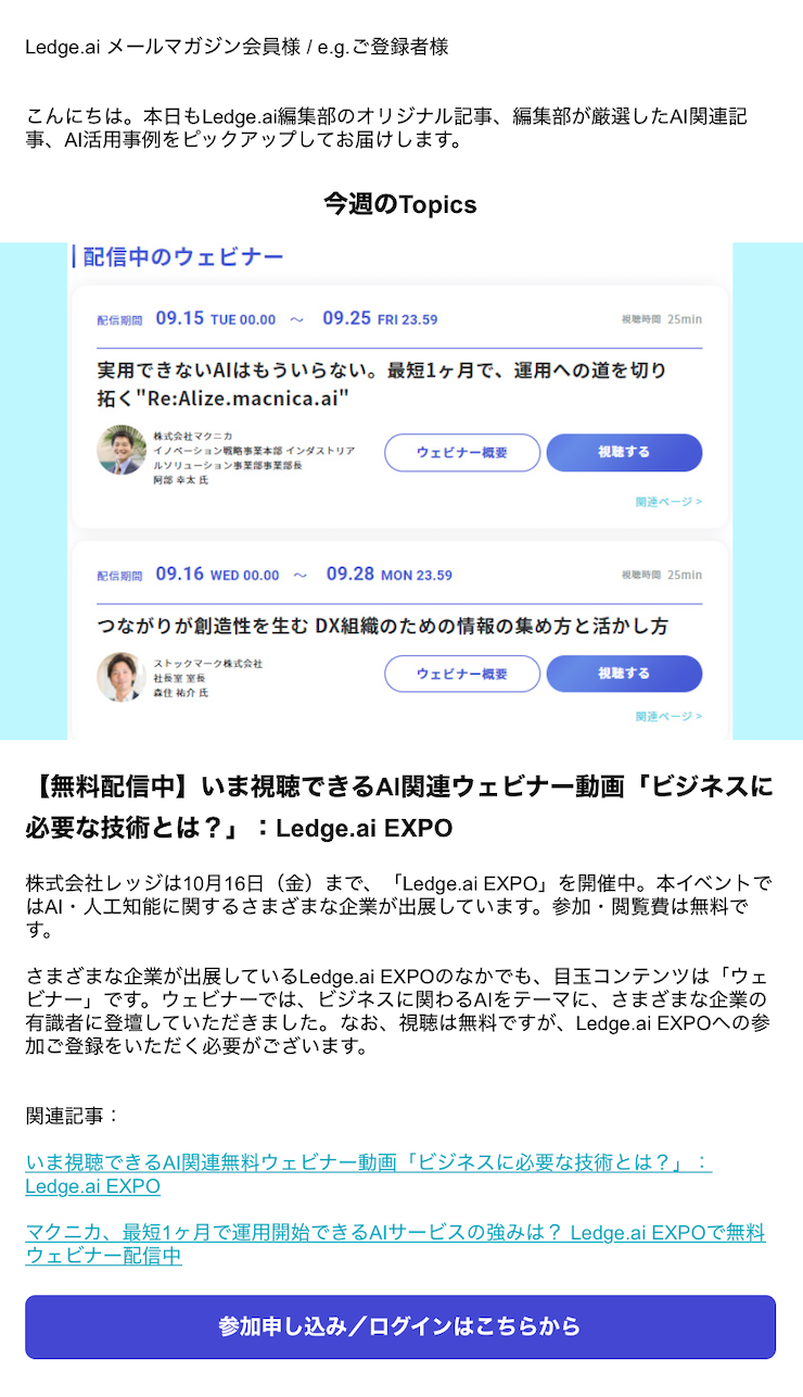 メールマガジンは、ウェビナーの情報やAIに関する注目の記事をピックアップした「今週のTopics」、最新の記事をセレクトした「Ledge.ai編集部ピックアップ」、AI活用事例を1つセレクトしてご紹介する「事例紹介」などで構成しています。