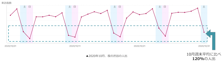 一方で、2020年10月の週末における夜の人出平均と比較した場合、新型コロナウイルス感染症(COVID-19)の影響が弱まっていると感じている人が多いのか、10月31日は約120%の増加傾向を示しているという。