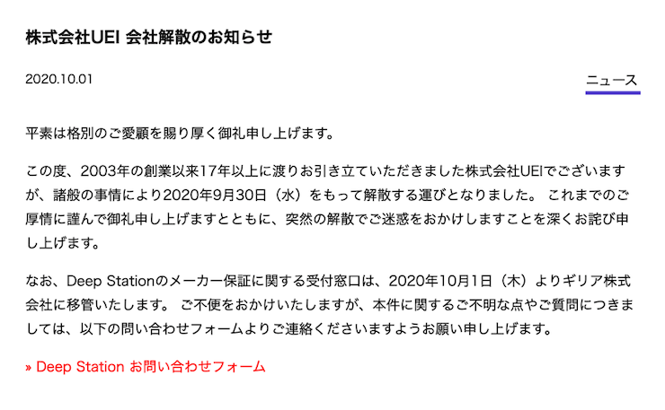 UEIは今回の解散に際して、「この度、2003年の創業以来17年以上に渡りお引き立ていただきました株式会社UEIでございますが、諸般の事情により2020年9月30日(水)をもって解散する運びとなりました。これまでのご厚情に謹んで御礼申し上げますとともに、突然の解散でご迷惑をおかけしますことを深くお詫び申し上げます」とコメントを寄せている。
