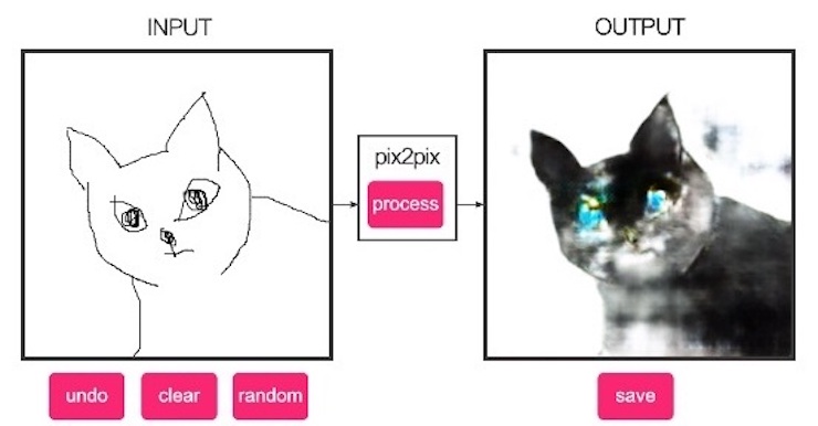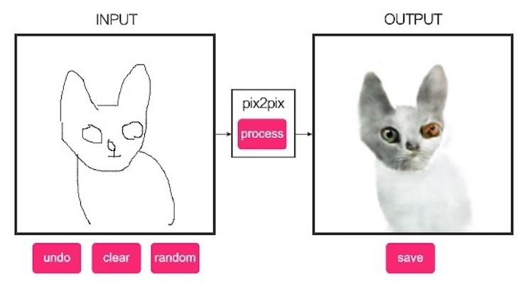 「Edges2cats」では、猫がこちらを見つめている様子や座っている様子をイメージした絵を描くと、あっという間にそのイラストにあった猫の写真に変換してくれる。