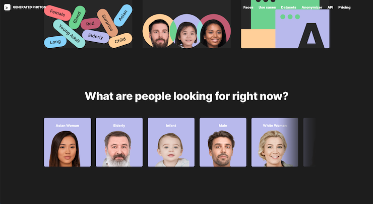 トップページにおいても、「アジア系女性」「高齢者」「幼児」「男性」「白人女性」など、さまざまなセグメントが用意されている。公式サイトによると、生成された顔写真は企業がソフトウェアでデモする際や、アプリでテストをする際などに活用されているとのこと。