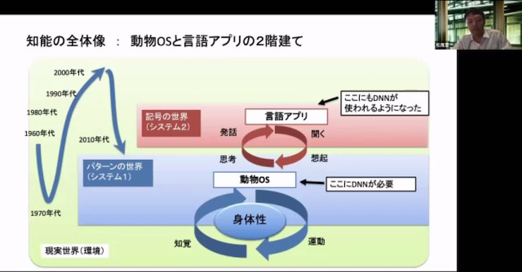 「動物OS」はベースとなる知覚や運動系のシステムで、「言語アプリ」は言語をつかさどる仕組みを意味する。知能は二階建て構造であり、「動物OS」の上に「言語アプリ」が乗っかった状態ではないか、というのだ。人間の言語理解は「どういう状況で何をしたら、何が起こるか」というイメージを想起し、早送りする機能を「動物OS」から呼び出すからこそ、成り立っていると話す。