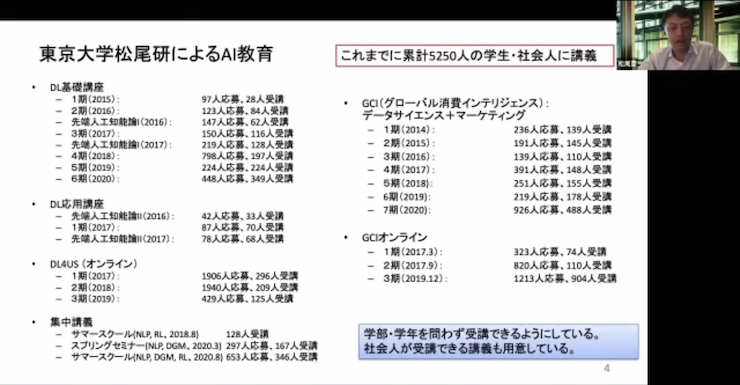 松尾豊さんは、さきほど触れたDeepXなどを生んだ東京松尾研について、「松尾研は2014年、2015年ぐらいから、ディープラーニングやAIの教育を東大のなかを中心に、これまで累計で5000人以上の学生や社会人にAIのことを教えています」と振り返った。
